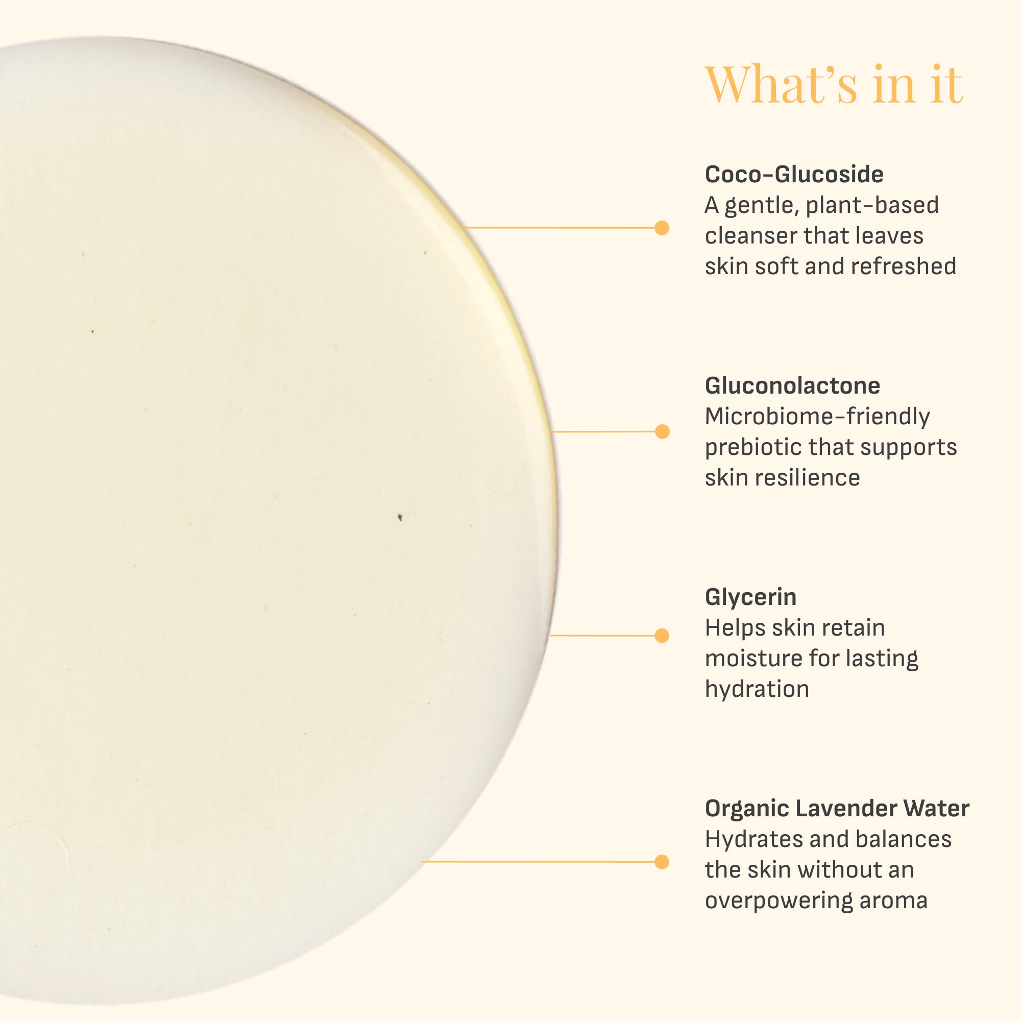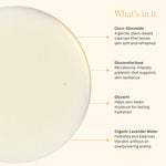 Wash: Water (Aqua), Lavandula Angustifolia (Lavender) Water, Decyl Glucoside, Cocamidopropyl Hydroxysultaine, Polyglyceryl-10 Caprylate/Caprate, Glycerin, Heptyl Glucoside, Xanthan Gum, Glyceryl Oleate, Hydrogenated Palm Glycerides Citrate, Coco-Glucoside, Tocopherol, Sodium Chloride, Ethylhexylglycerin, Citrus Aurantium Dulcis (Sweet Orange) Peel Oil, Citrus Reticulata (Red Mandarin) Peel Oil, Citrus Reticulata (Tangerine) Peel Oil, Citric Acid, Calcium Gluconate, Gluconolactone, Phenoxyethanol, Sodium Benzoate, Limonene