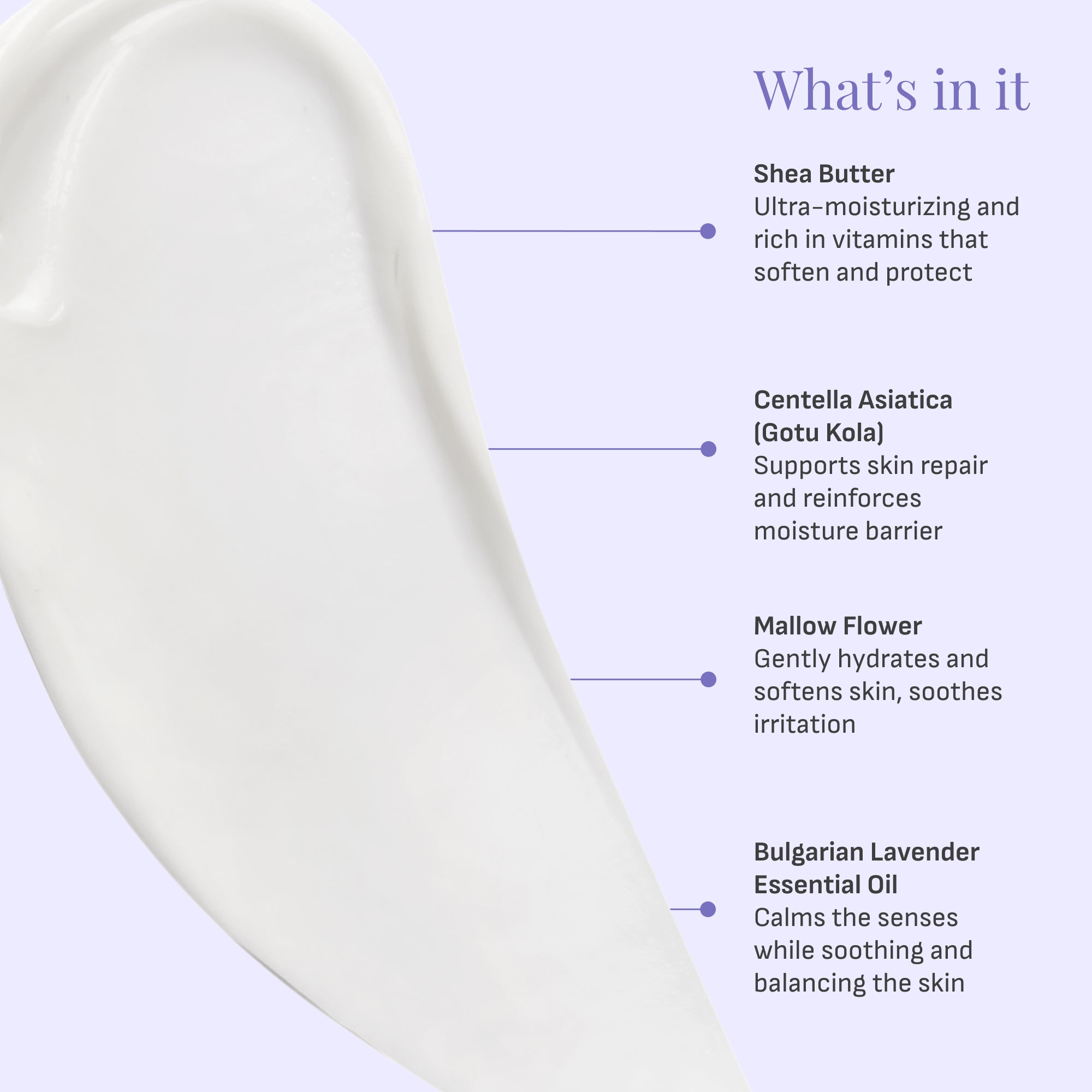 Water (Aqua), Cetyl Alcohol, Butyrospermum Parkii (Shea) Butter*, Isosorbide Dicaprylate, Shea Butter Glycerides, Simmondsia Chinensis (Jojoba) Seed Oil*, Olea Europaea (Olive) Fruit Oil, Myristic Acid, Glycerin, C12-16 Alcohols, Lavandula Angustifolia (Lavender) Oil*, Glycine Soja (Soybean) Oil, Hydrogenated Lecithin, Centella Asiatica (Gotu Kola) Extract, Malva Sylvestris (Mallow) Flower Extract, Olea Europaea (Olive) Leaf Extract, Plantago Major (Plantain) Leaf Extract, Tamarindus Indica (Tamarind) Extract, Tocopherol, Xanthan Gum, Palmitic Acid, Ethylhexylglycerin, Sodium Hydroxide, Calcium Gluconate, Gluconolactone, Phenoxyethanol, Sodium Benzoate, Linalool, Limonene. *Organic.