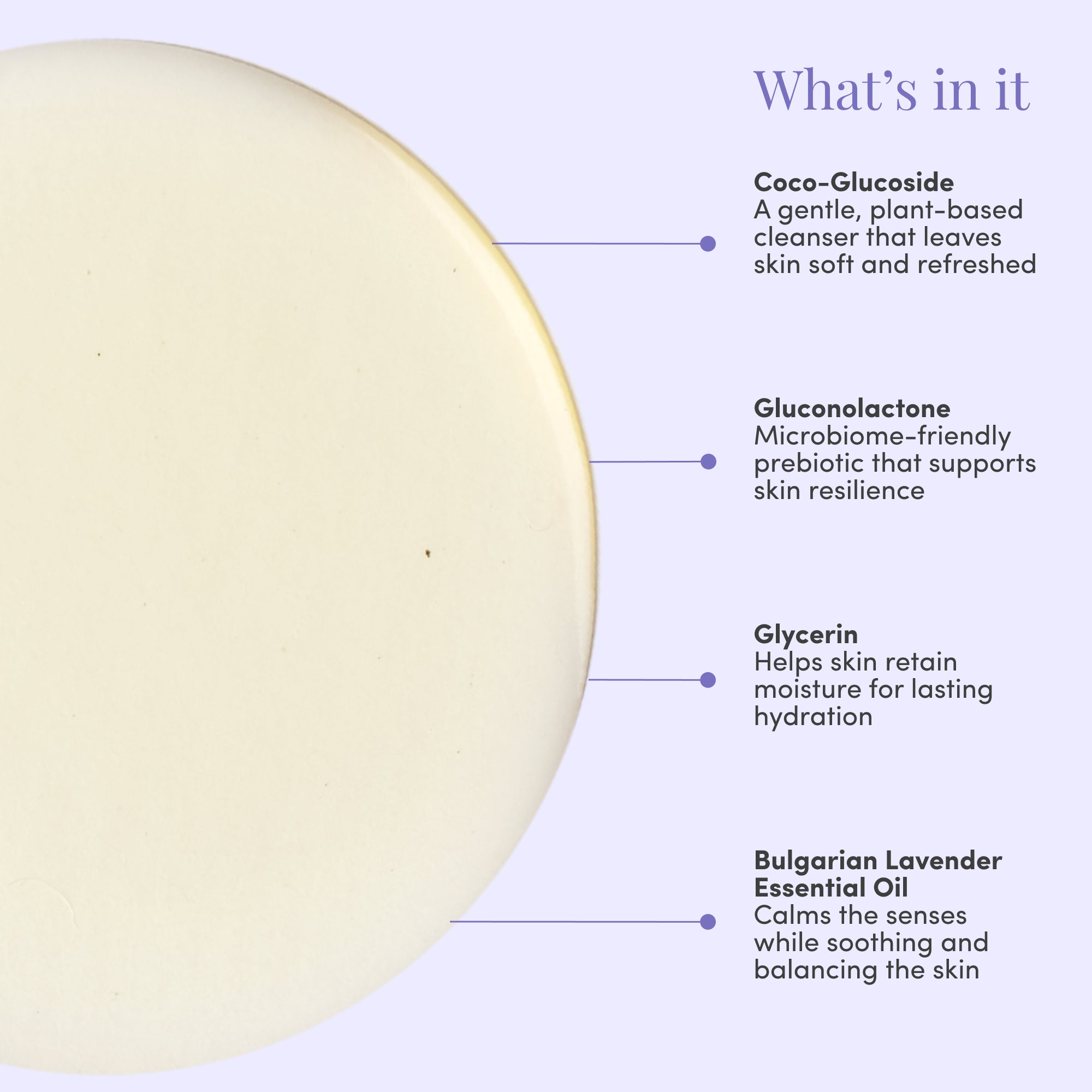 Water (Aqua), Lavandula Angustifolia (Lavender) Water, Decyl Glucoside, Cocamidopropyl Hydroxysultaine, Polyglyceryl-10 Caprylate/Caprate, Glycerin, Heptyl Glucoside, Xanthan Gum, Glyceryl Oleate, Coco-Glucoside, Sodium Chloride, Ethylhexylglycerin, Lavandula Angustifolia (Lavender) Oil*, Citric Acid, Sodium Hydroxide, Calcium Gluconate, Gluconolactone, Phenoxyethanol, Sodium Benzoate, Linalool. *Organic.